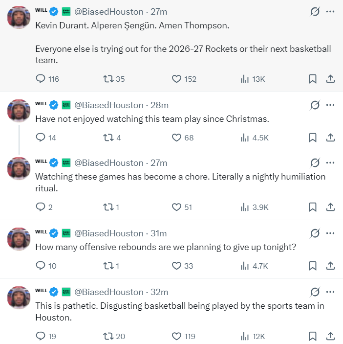 休媒Will:火箭队这是在备战26-27赛季了吗?我很难想象观看火箭的比赛是一件令人厌烦的事,每一个夜晚感觉都是在被屈辱困扰。我们一场比赛要丢多少个后场篮板?这两场失利太可悲了,火箭队目前所打的篮球简直令人作呕。