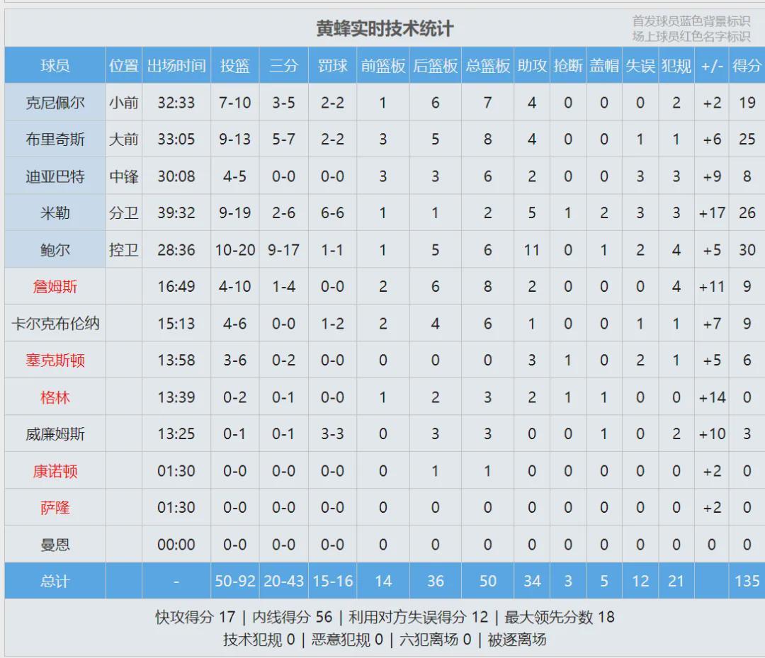 首节战罢,湖人39-30!从第一节最后2分钟到第二节结束,湖人进攻断电,5分多钟没有运动战进球。黄蜂打出一波41-19的进攻狂潮,直接完成反超。小桥上半场6中6得到17分,米勒13分进账。三球扎心了,半场6中1仅得3分。